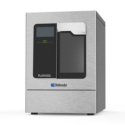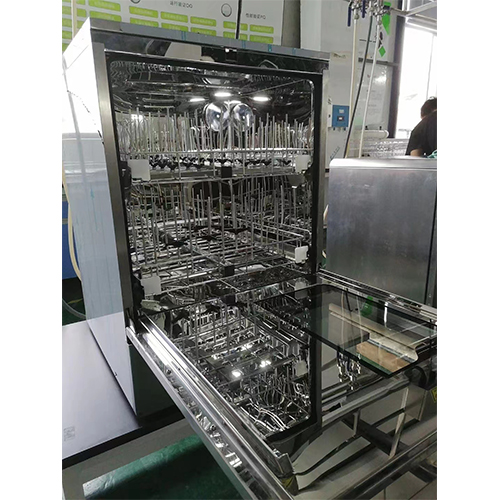 將實驗室器皿裝載到器皿裝載籃架上通過滑軌載入清洗機內腔中,通過清洗步驟去除器皿上的污染物(包括有機物、無機物、蛋白質等),使器皿上的殘留物被清洗掉;通過漂洗步驟去除器皿上污染物和清洗劑殘留,使器皿上離子殘留量低于檢測下限,通過去除器皿上細胞、病毒、細菌殘留,使活微生物數量減少到規定水平。